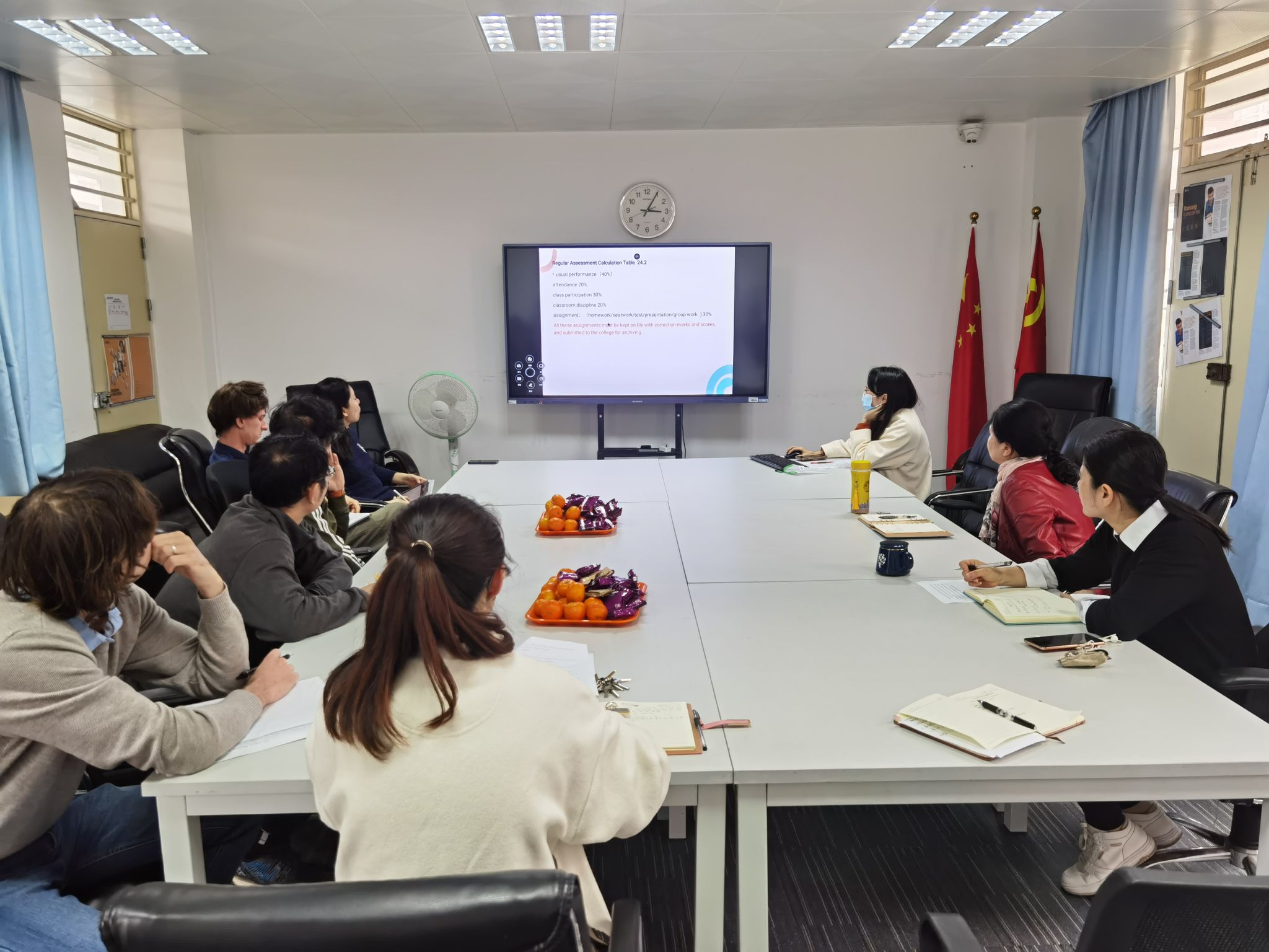 刘敏姬副院长向与会教师介绍了学校教育教学审核评估相关工作安排,说明了教学评估的时间节点与相关工作要求,并要求教师们认真完成相关评估材料,以评促建,上好每一节课,关爱学生,助力学生成长。国际教育科陈玉嫣老师向教师们详细介绍相关教学文件的要求。