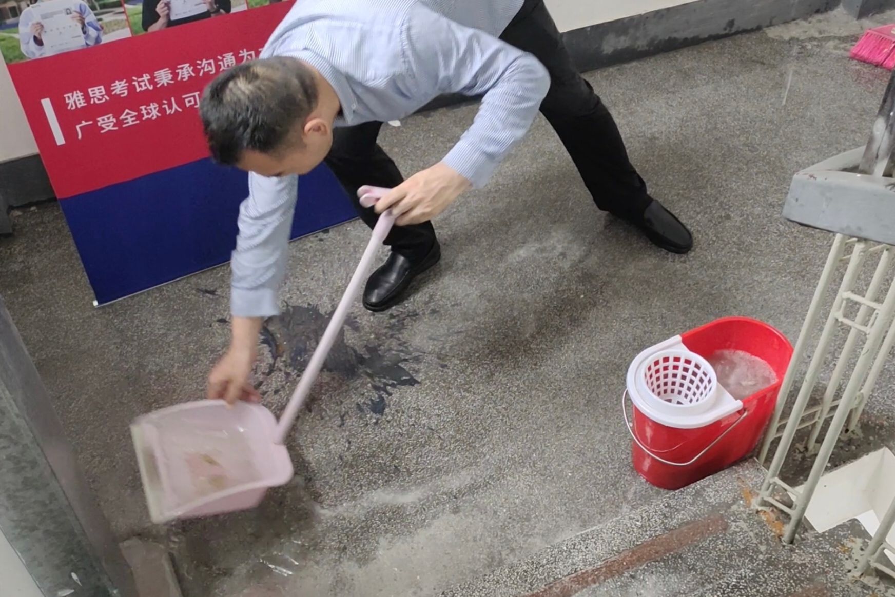 3月29日,广州遭遇罕见强降雨,短时间的强降水导致学院楼顶排水系统超负荷运转,楼顶雨水倒灌险情突如其来。而此时,英国威廉集团正在进行雅思考试,一旦雨水渗入考场,不仅会影响考试正常开展,更会为考生带来不便甚至危险。危急时刻,学院教工党员闻令而动、迅速集结,没有丝毫犹豫,立即投入到紧急防水处置工作中。大家分工明确、默契配合,有的冒雨搬运沙袋,在楼顶入口、排水口周边筑牢防水屏障;有的俯身疏通堵塞的排水通道,徒手清理杂物、排除积水,任凭雨水浸透衣衫、污泥沾满裤脚,始终坚守在防汛一线。经过数小时的奋战,倒灌险情被成功遏制,考场环境保持安全稳定,当天的雅思考试得以顺利完成,在场考生的情绪也得到有效安抚,用速度与担当守住了考生的“追梦之路”。
